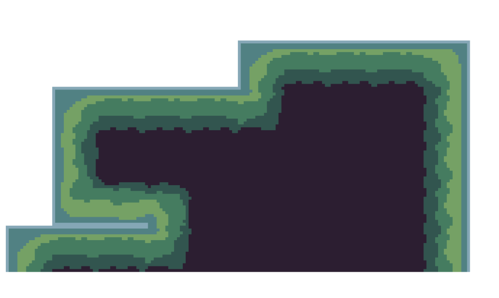 With Aseprite 1.3, you can easily use tiles like these to make structures very quickly. Using these 13 tiles, I was able to make this “landmass” (which may be used later for a 2D platformer game) in less than 5 minutes: