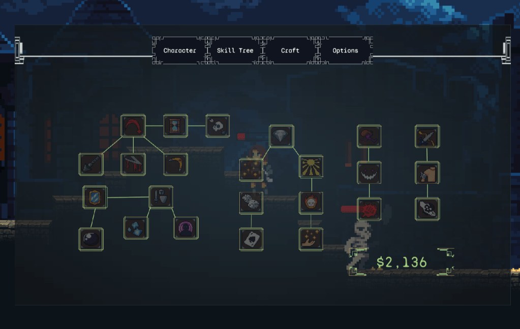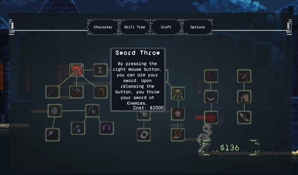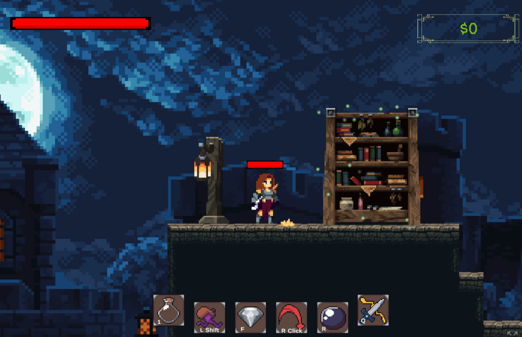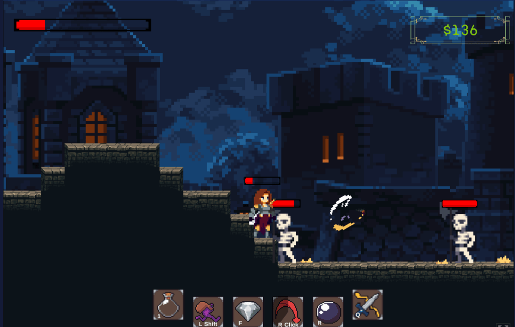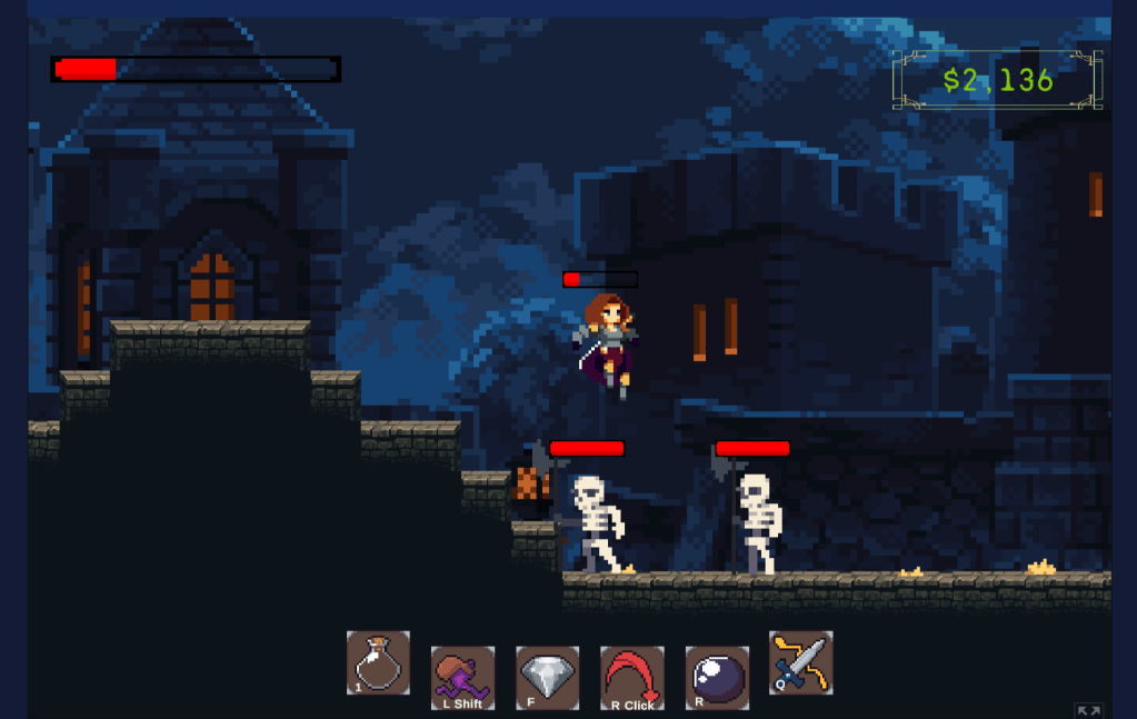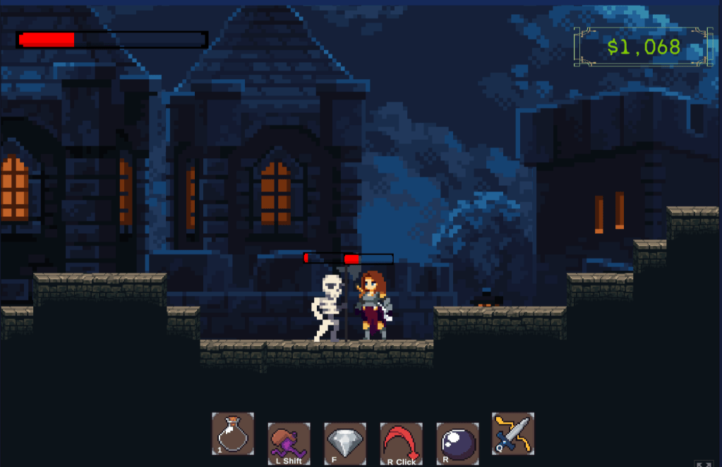 Haunted Castle is a brief dark fantasy platformer in which you can use a stat-driven combat system to slay skeletons, collect loot and currency, craft equipment to bolster your stats and gain new abilities, and unlock a plethora of skills within a comprehensive skill tree. The game is browser based and exhibits save-and-load functionality. No download is required to play. It is approximately a 30 to 40 minute experience.